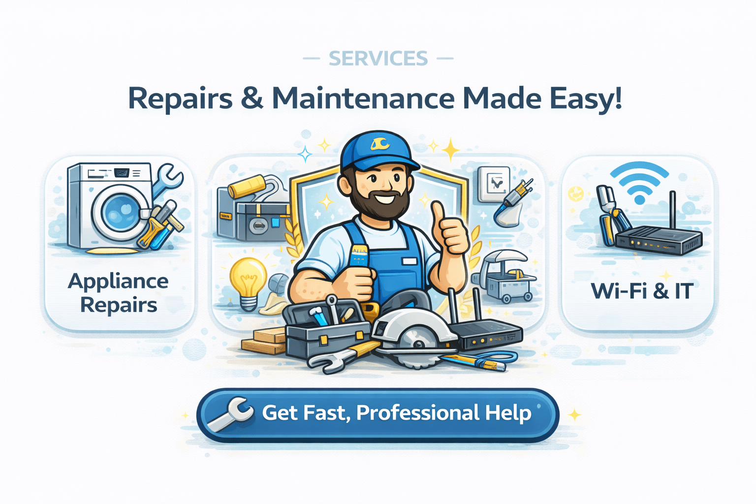 One team for the jobs that keep a property running: appliance repairs and installs, handyman and multi-trade maintenance, plus Wi-Fi and home/business networking. Less chasing trades, faster solutions.